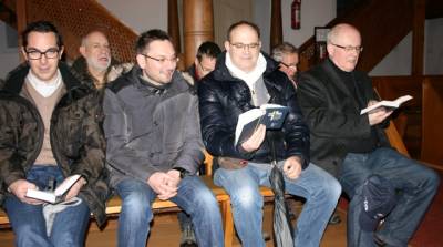 Gestärkt mit einem Schluck Glühwein und einer Käsestange in der Kantine des Unternehmens nahmen die CDU-Wanderer die letzte Station in Angriff, um in Sigmarswangen in der dortigen evangelischen Kirche durch Pfarrer Thomas Hämmerle einen umfassenden Überblick über die St. Jakobus-Kirche und die Entwicklung der Pfarrgemeinde in den vergangenen Jahrhunderten zu erhalten. Sie bildet heute zusammen mit Wittershausen eine Pfarrgemeinde. Nach einer sehr wechselvollen Geschichte, in der Pfarrer Hämmerle auch die Bedeutung der Jakobswege einfließen ließ und erwähnte. Ein gemeinsam gesungenes „Großer Gott“ und das Vater unser beendeten diesen Teil der Winterwanderung, der so oder so ähnlich immer zum Repertoire der alljährlichen Winterwanderung gehört.